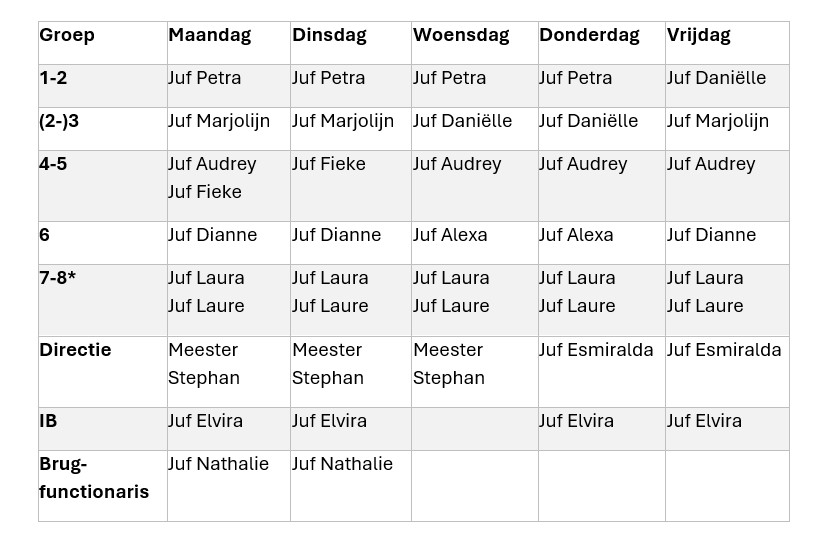 Ons team bestaat uit 12 personen. In onderstaand schema kunt u zien op welke dag welke juf voor de groep staat: